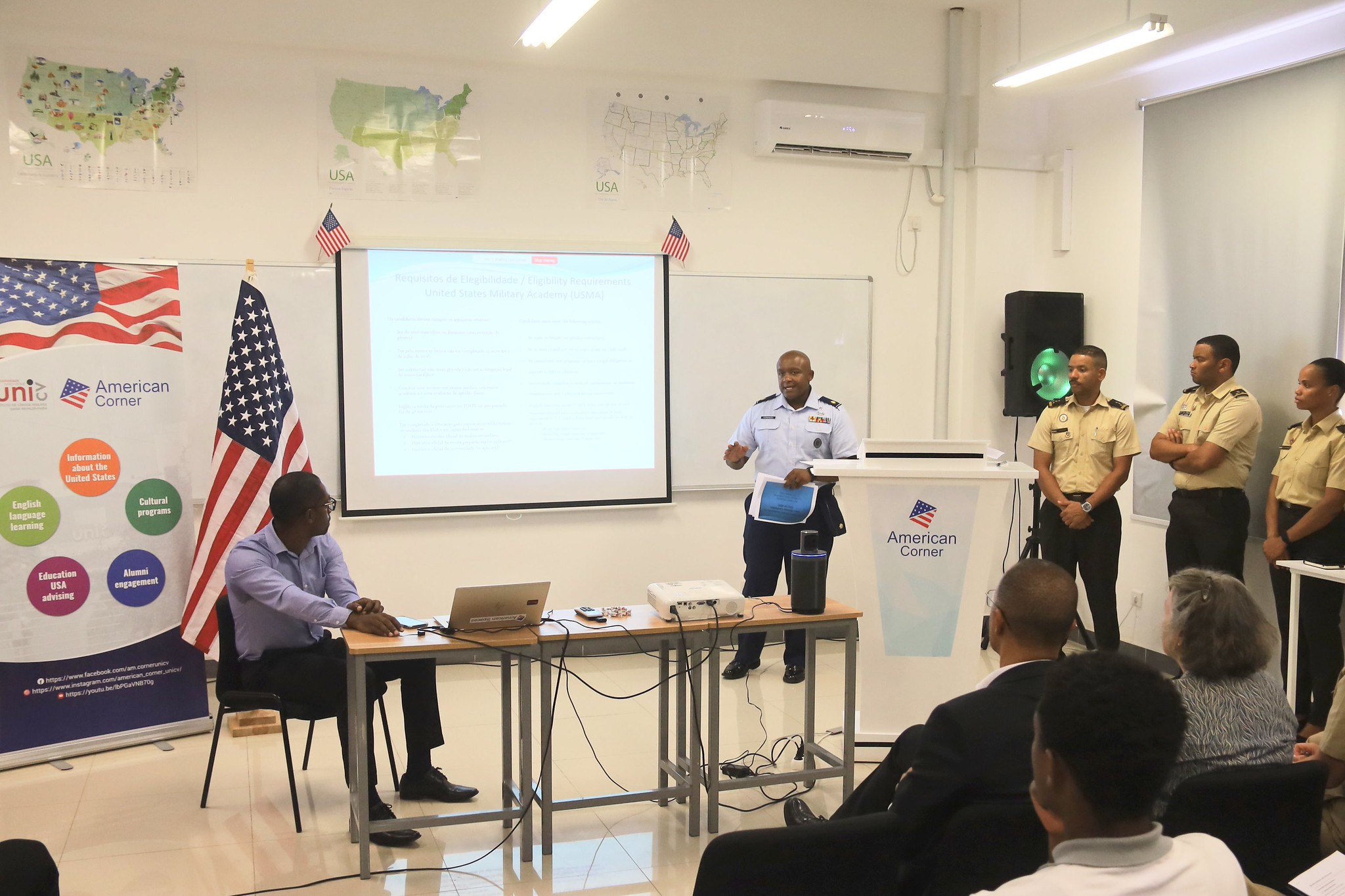 As Forças Armadas de Cabo Verde em parceria com o Grupo Militar dos EUA Cabo Verde, estendem um caloroso agradecimento ao American Corner na Universidade de Cabo Verde por acolher a sessão de informação de hoje sobre oportunidades na Academia Naval dos EUA (USNA) e nos EUA. Academia Militar (USMA).