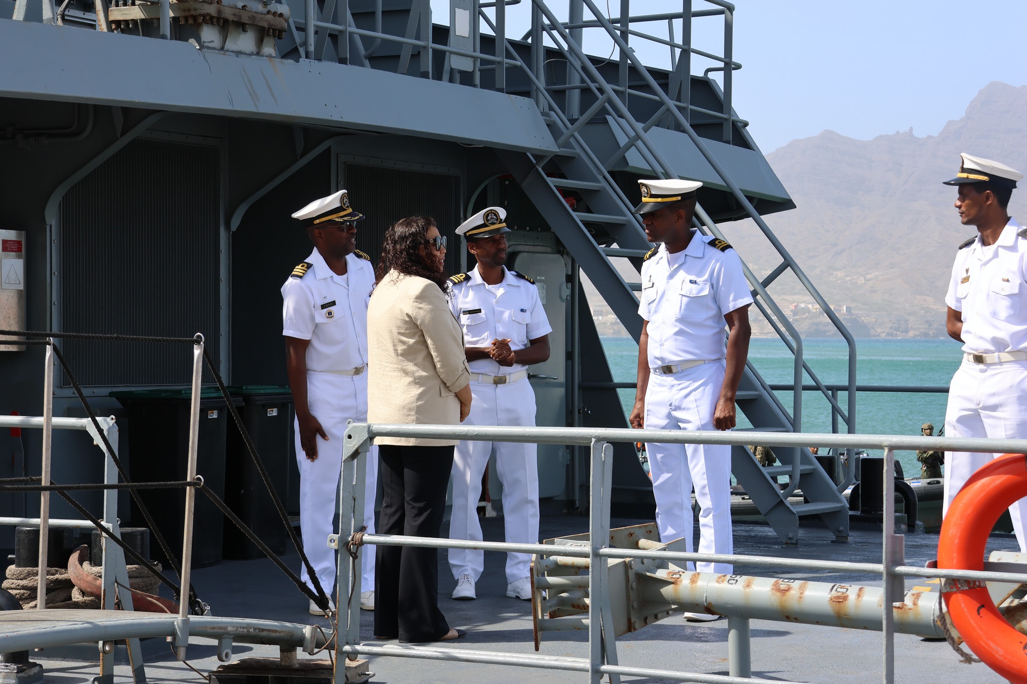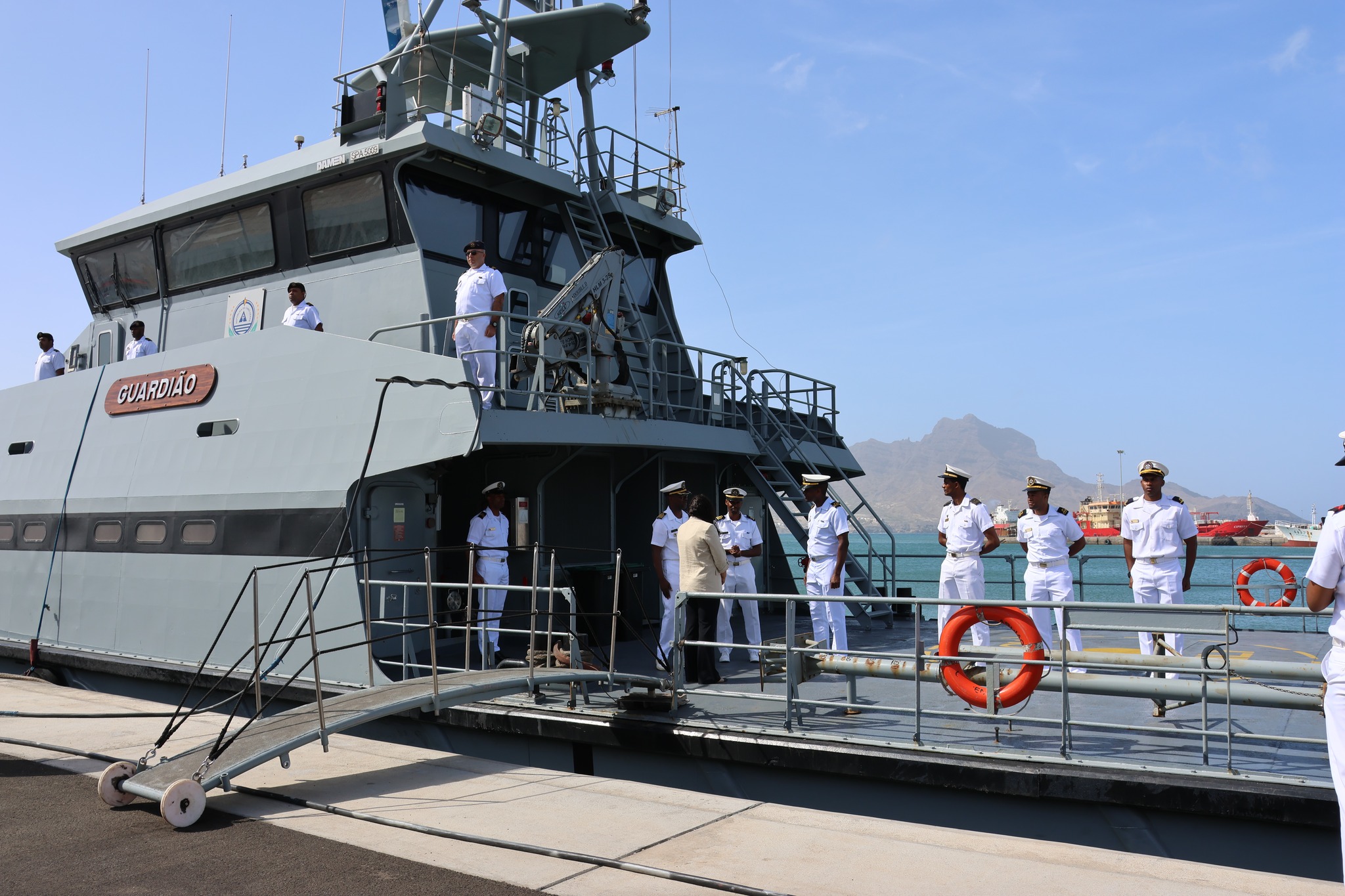 Na sua última missão à São Vicente, a Ministra de Estado e da Defesa Nacional, Janine Lélis, visitou o Navio Patrulha (NP) Guardião, onde pôde constatar, in loco, os resultados dos trabalhos de reparação e manutenção realizados, até ao momento, nesta embarcação essencial para o cumprimento das missões das Forças Armadas.
