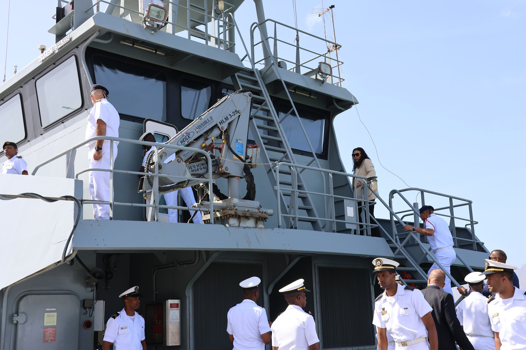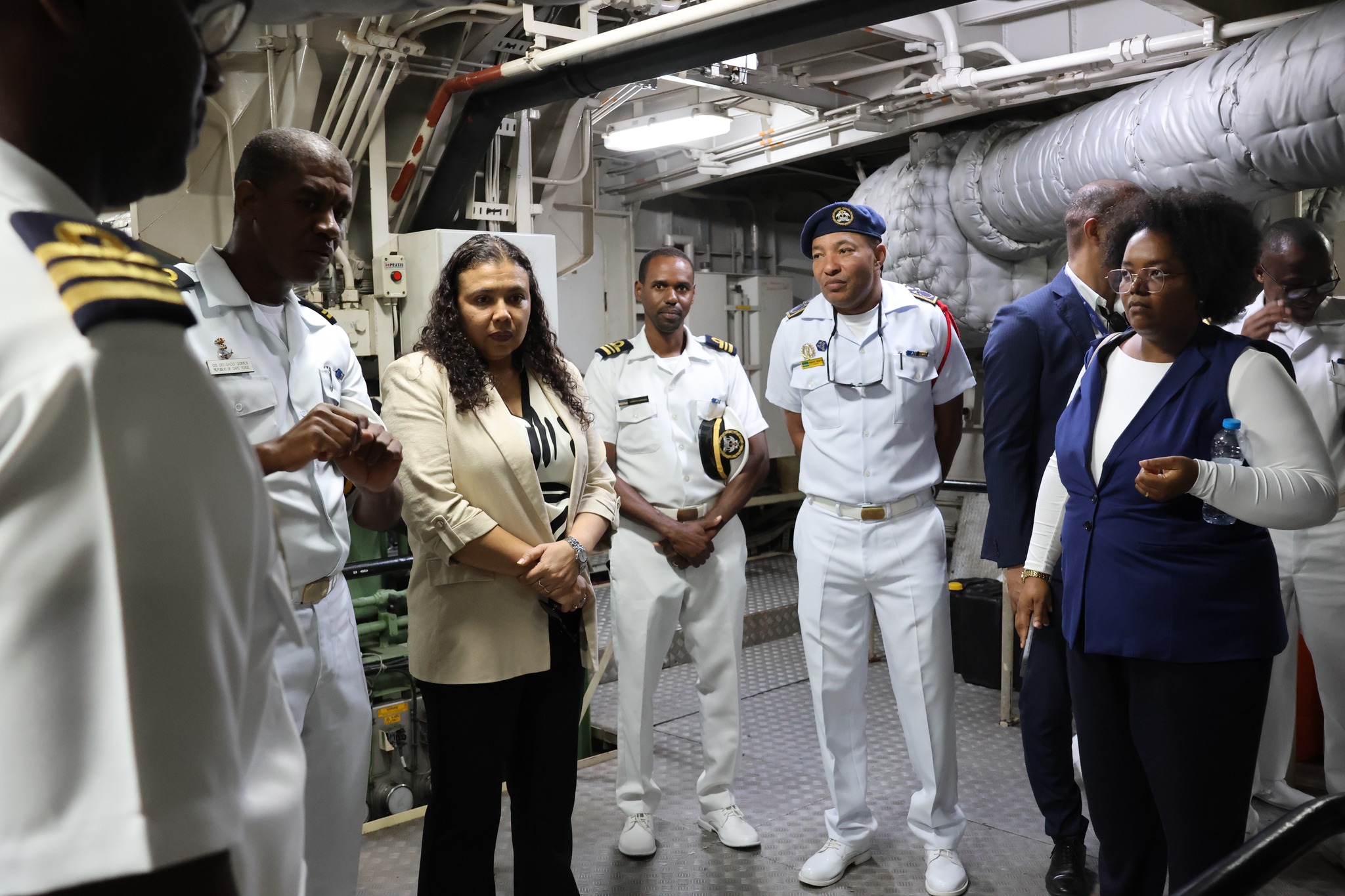 Na sua última missão à São Vicente, a Ministra de Estado e da Defesa Nacional, Janine Lélis, visitou o Navio Patrulha (NP) Guardião, onde pôde constatar, in loco, os resultados dos trabalhos de reparação e manutenção realizados, até ao momento, nesta embarcação essencial para o cumprimento das missões das Forças Armadas.